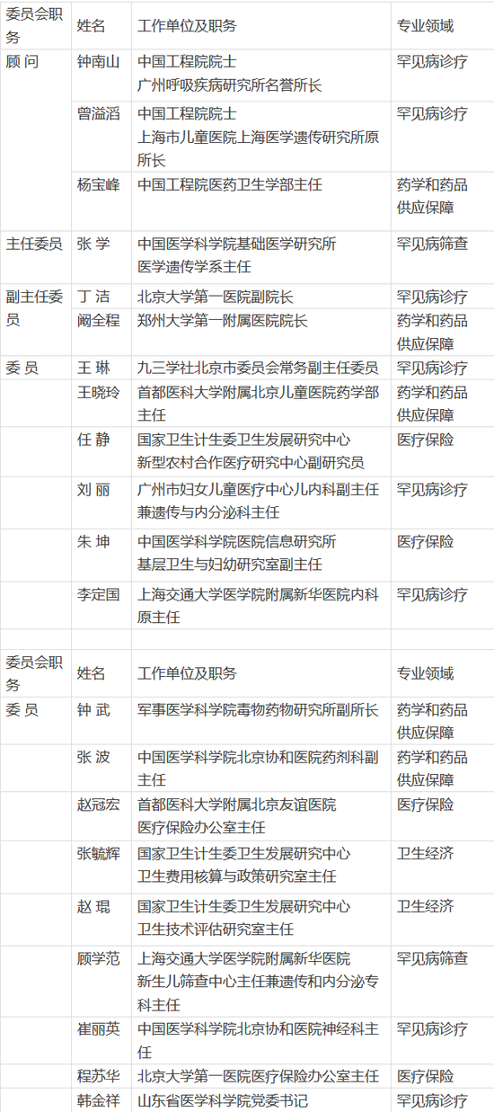 罕見(jiàn)病診療與保障專(zhuān)家委員會(huì)成員中,罕見(jiàn)病診療領(lǐng)域6人,藥學(xué)和藥品供應(yīng)保障領(lǐng)域4人,罕見(jiàn)病篩查領(lǐng)域、醫(yī)療保險(xiǎn)領(lǐng)域、新農(nóng)合領(lǐng)域、衛(wèi)生經(jīng)濟(jì)學(xué)領(lǐng)域各2人。專(zhuān)家委員會(huì)的工作職責(zé)是:研究提出符合我國(guó)國(guó)情的罕見(jiàn)病定義和病種范圍,組織制定罕見(jiàn)病防治有關(guān)技術(shù)規(guī)范和臨床路徑,對(duì)罕見(jiàn)病的預(yù)防、篩查、診療、用藥、康復(fù)及保障等工作提出建議。專(zhuān)家委員會(huì)自發(fā)文之日起任期3年。