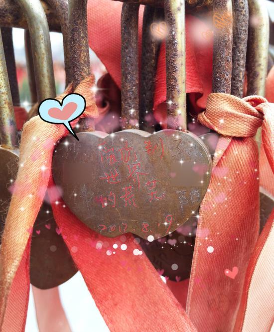 網名為紫菜Dan花湯的游客,兩年前曾與初戀女友游玩清園,當時在同心鎖處留下了愛的印記。現在與女友分手了,發布微博,希望有朋友幫忙找到兩年前的同心鎖,并重溫當時的記憶。官博小編看到紫菜Dan花湯的希望,第一時間前往景區鎖壇,花了近一個小時時間從上萬把同心鎖中找到了那把愛心鎖,當小編看到鎖面上“愛你到世界的荒蕪”時,瞬間被網友的癡情所打動,謝謝你們把暖暖的希望寄托在清明上河園。