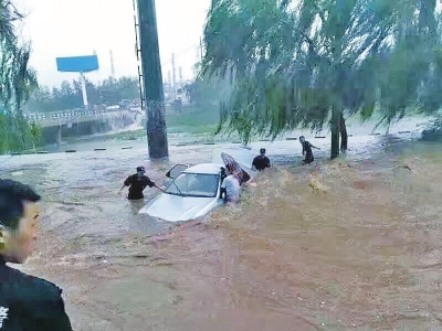 “當時雨太大,路面已成河,那個路段水齊腰深,我們都是趟著水過去。”吳剛說,該轎車內有一男一女,剛出小區門口,車子便被浸泡,造成發動機熄火,之后又被水流向南沖了30米左右,絆住一個臺階才停了下來。而其旁邊就是一河道,若車被沖入河道,后果不堪設想。