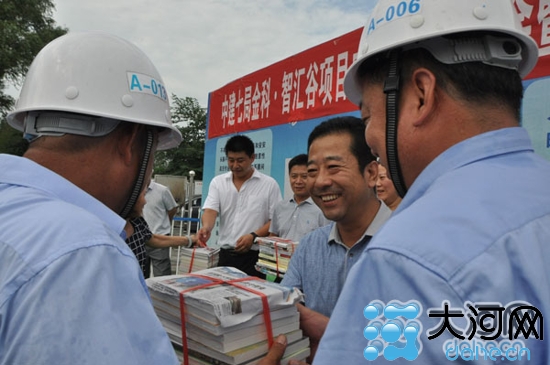 活動現(xiàn)場7月25日下午,中建鄭州發(fā)展公司副總經理白更言、中建七局中原建設公司總經濟師魯兵,工會副主席耿錦勇及智匯谷項目部經理祝林濤、書記劉世英等共赴智匯谷項目施工工地慰問。為現(xiàn)場的農民工兄弟和項目管理人員送去了防暑降溫清涼大禮包,并向農民工漂流書屋贈送了書籍。