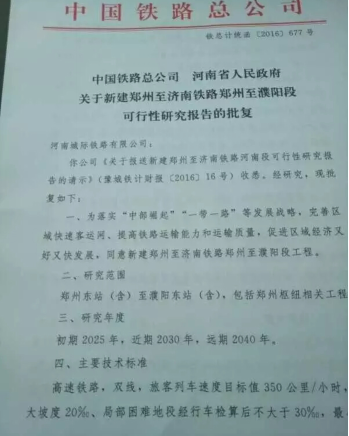 今年8月底,中國鐵路總公司、河南省人民政府發布《中國鐵路總公司、河南省人民政府關于新建鄭州至濟南鐵路鄭州至濮陽段可行性研究報告的批復》鐵總計統函〔2016〕677號,同意該線路的批準建設。從批復名稱可以看出,該批復并非鄭濟高鐵全段,而只是鄭州至濮陽段,目前山東段可研報告仍沒有批復。