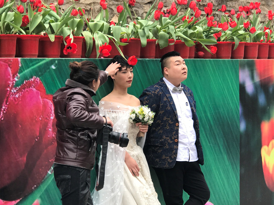 不過,在人群中,有一對男性情侶顯得有些特別,他們身著禮服和婚紗,在郁金香花叢中按照攝影師的指示擺出各種造型,親密的舉止,引來了不少游客的駐足圍觀。