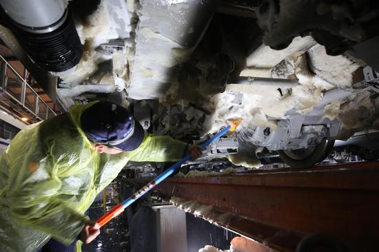 針對今年入冬出現的范圍最大、強度最強的一次降雪,鄭州動車段迅速啟動應急處置預案,在關鍵處所鋪設防滑草墊,組織人員清除道路積雪;利用橡膠鏟、融冰除雪車對入庫動車組轉向架、風擋等結冰積雪部位進行清除。同時,要求檢修人員嚴格落實動車組檢修作業標準,加大對動車組走行部、裙底板等關鍵部位的檢查,并對動車組司機室、制動系統等系統功能狀態進行試驗,保證狀態良好,全力確保動車組檢修運用工作平穩有序。(通訊員:吳有志)