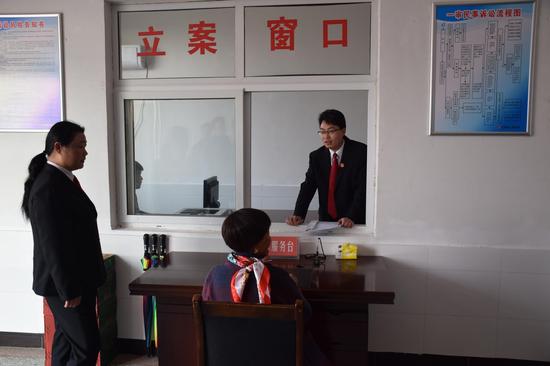 一大早,在法庭的立案窗口,已經(jīng)有幾位群眾在排隊(duì)立案或咨詢(xún)事情是否應(yīng)該到法庭解決。筆者看到,立案窗口設(shè)立了便民服務(wù)臺(tái),為來(lái)訪當(dāng)事人準(zhǔn)備了老花鏡、筆、紙、印泥、雨傘等,雖然還是有些簡(jiǎn)陋,但確實(shí)為當(dāng)事人提供了很大方便。據(jù)庭長(zhǎng)劉富介紹,2017年?yáng)|壩頭法庭共受理案件634起,這些案件中的大多當(dāng)事人不需要跑到10公里外的蘭考縣法院,往往在法庭就能解決自己的問(wèn)題。