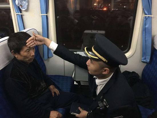 2分鐘到達現場,看到旅客孟某口吐白沫、渾身用力不時有抽搐現象疑是癲癇癥狀,梁車長與乘務員王海,在紅十字救護員的指導下,立即撬開患者緊咬的牙關,塞上毛巾防止他咬舌并按壓人中。 經過5分鐘的救治,患者漸漸停止抽搐,隨后趕來的乘客醫務工作者與紅十字救護員對患者進行體征檢查,旅客體征逐漸平穩,列車長梁文丕端來溫水讓其喝下,并用毛巾擦拭臉上的污物。 經詢問獲悉,該旅客患有癲癇病史,不成想在乘車途中突發犯病,出行又無隨性陪同人員,為安全起見,梁車長專門用電話聯系其家人告知情況,到站派人來接。一場揪心的搶救使該旅客脫離危險,列車長梁文丕安撫四周旅客回到座位上精心休息。并叮囑15車乘務員值乘中密切關注該旅客孟某身體狀況。