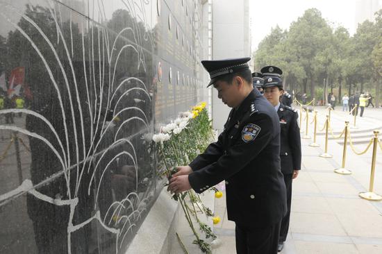 在河南公安英烈紀念墻前,全體民警手執白花,脫帽默哀,向為人民公安事業英勇獻身的公安英烈致敬,青年民警代表宣讀了向英烈學習倡議書,全體民警重溫了入警誓詞。之后,全體民警緩步繞行英烈墻,向公安英烈敬獻鮮花,瞻仰英烈,學習他們的先進事跡,汲取奮進力量。