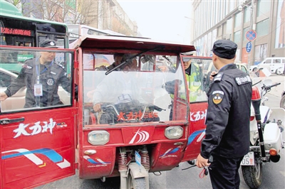 針對部分非法營運三輪車車主見到交警在路口攔截執(zhí)法,常常拒不配合檢查強行離去的問題,警方調(diào)整部署和方法,采取拖車圍堵、警用摩托車機動配合攔截的方式,對闖崗者進行嚴厲查處。執(zhí)法過程中,一名試圖強行闖崗的非法營運三輪車車主被民警控制。