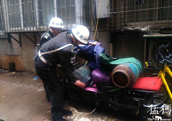 當日下午,位于該小區六號樓下,這輛雨中的電動車只覆蓋了一件雨衣,而充電器和插座被塞在兩只破舊的煤氣罐之間進行著充電。當汝河路巡防員在巡邏樓下發現這一幕時很是震驚,當即將電源斷掉,并上樓尋找車主。