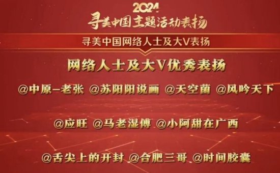 新鄉(xiāng)市新的社會(huì)階層人士@中原-老張、信陽(yáng)市新的社會(huì)階層人士@應(yīng)旺、開(kāi)封市新的社會(huì)階層人士@舌尖上的開(kāi)封、濟(jì)源市新的社會(huì)階層人士@豫韻之旅榮獲2024年度尋美·中國(guó)網(wǎng)絡(luò)人士及大V優(yōu)秀表?yè)P(yáng)