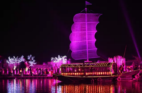 伴隨著“東風(fēng)夜放花千樹,更吹落,星如雨”,夜空的煙花,像一朵朵秋日的金絲菊。隨后,一輛晶瑩剔透的雕車被一匹活靈活現(xiàn)的工藝馬牽引著,它看上去像是用碩大的美玉雕出來的,從湖面緩緩劃過,香車寶馬,玉石寶物,眼前的場景極盡奢華。