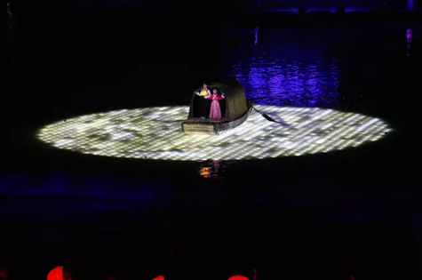 水中明月是浪漫的代名詞,演出中一輪金黃的水中月伴著小橋流水,葉葉扁舟,靜靜地躺在湖面。湖面上隨著燈光,少男少女翩翩起舞,亦真亦幻,引人無限遐想。