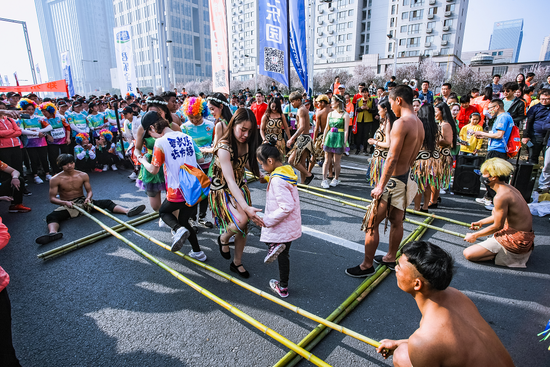 開(kāi)跑前,來(lái)自佤族的演員帶著竹竿來(lái)到了現(xiàn)場(chǎng),拉上周?chē)倪x手來(lái)一段快樂(lè)的竹竿舞,為馬拉松增添了歡樂(lè)的氛圍。