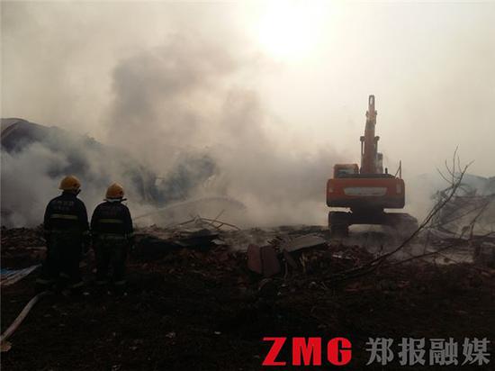 失火的沙發廠上空依然濃煙滾滾,一臺勾機在廠區南側不斷破拆車間棚頂及墻壁,以配合消防官兵的救援。