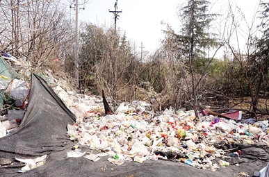 昨日下午3時30分許,記者在現場看到,在沿建設路北邊的廊道北側,東西大約近百米的長度內,高約4米的一道生活垃圾傾倒帶綿延在廊道邊,有些地方已經到了廊道內,將廊道綠色植埋壓。記者上到垃圾傾倒上方進行查看,發現生活垃圾都是從北向南向廊道內推進,最上方有明顯的車轍痕跡和新近留下的垃圾堆。