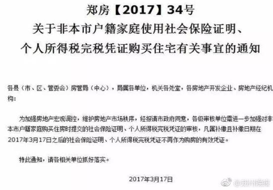 通知指出,為加強房地產宏觀調控,維護房地產市場秩序,經報請市政府同意,各級審核單位需進一步加強對非本市戶籍家庭購買住房時提交的社會保險證明、個人所得稅完稅憑證的審核,凡屬補繳且補繳日期在2017年3月17日之后的社會保險證明、個人所得稅完稅憑證不再作為購房的有效憑證。