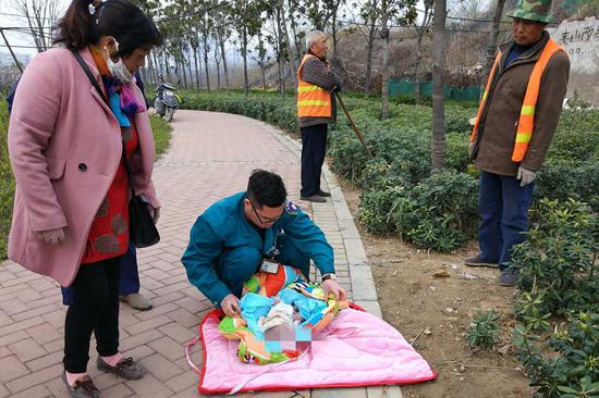 隨后記者趕到現場,在上述事發地看到先期趕來的急救人員將嬰兒抱到了廊道開闊地正在給嬰兒做檢查,但遺憾的是,發現已無生命體征。旁邊轄區警方正在對先期發現的環衛工進行詢問。