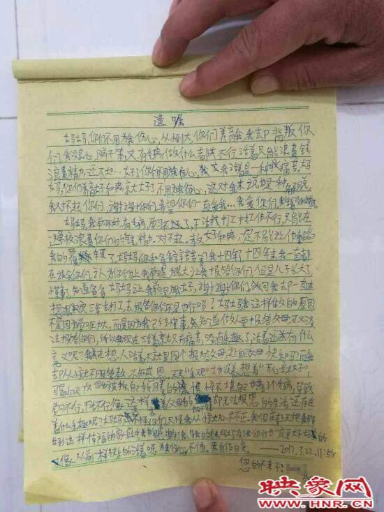 當天下午其父母向記者提供了小豪的遺書。據小豪留下的遺書稱,因為自己已經懂事,父母讓自己學習也是對自己好,因為自己腦子“笨”,做啥都不行,沒法報答父母的養育之恩。讓爸媽不要因為自己的離去而傷心。小豪在遺書的結尾也感謝打他罵他的老師。