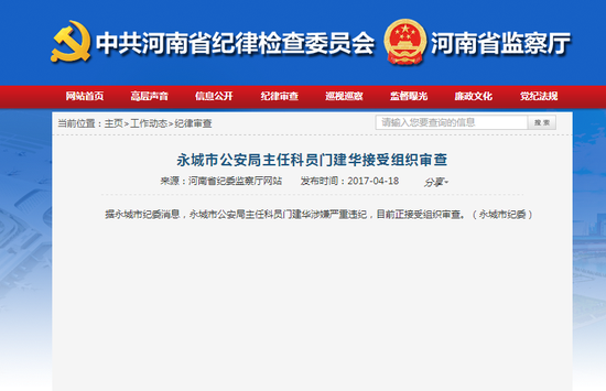 中國經濟網北京4月18日綜合報道 據河南永城市紀委消息,永城市公安局主任科員門建華涉嫌嚴重違紀,目前正接受組織審查。(永城市紀委)