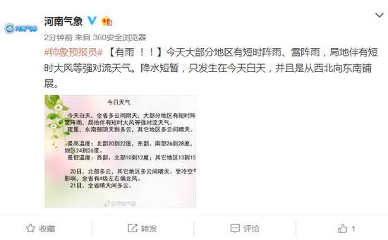 昨天20時3000米上空,東勝到平涼一線有一低槽,短期內東移影響我省。 今天02時地面圖上,我省處于東高西低的氣壓場里。 今天白天,全省多云間陰天,大部分地區有短時陣雨、雷陣雨,局地伴有短時大風等強對流天氣。夜里,東南部陰天到多云,其它地區多云間晴天。 最高溫度:北部20到22度,東部、南部26到28度,其它地區24到26度。 最低溫度:西部、北部10到12度;其它地區13到15度。鄭州市: 今天白天,多云間陰天,有短時陣雨、雷陣雨,局地伴有短時大風等強對流天氣。夜里,多云。偏南風2到3級轉西北風3到4級。最高溫度:26到27度;最低溫度:13到14度。