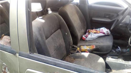 10分鐘后,記者趕到淮河路鄭密路附近的這個小區(qū),發(fā)現(xiàn)果然如王先生所說:一輛銀灰色汽車四輪被牢牢地固定在地面,沒有了倒車鏡和玻璃,車身布滿灰塵,車內(nèi)垃圾遍地。該車頭北尾南的停在小區(qū)主要道路上,留下的兩尺間隙只夠單人通過。