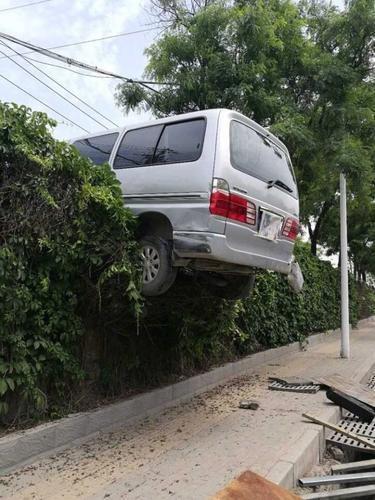 今天中午12點左右,在二環支路與嵩山路的鐵路橋東50米的橋上,一輛面包車倒車失控,尾部突然沖出綠化帶停下,懸到半空,如果不是綠化帶護欄攔著,恐怕車已墜落傷人傷己,著實讓路過的市民下了一跳。