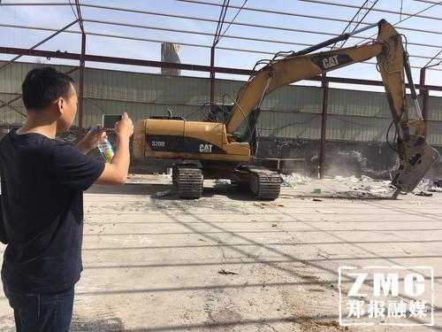 之后,挖掘機進入廠房內,開始對這里的水泥地面,進行破拆。一時間轟鳴聲四起,原來的水泥地面被破碎。