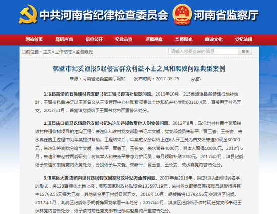 2007年至2016年,斜里村以虛列村民名字的形式,將120畝集體土地上報,套取國家財政補貼資金133597.19元,該村黨支部委員兼報賬員胡愛梅將其中12798.56元據為己有,其他資金用于村委日常開支。2016年10月,胡愛梅將12798.56元交淇濱區紀委。2017年1月,淇濱區紀委給予胡愛梅留黨察看一年處分;2017年2月,淇濱區紀委給予該村現任黨支部書記王伏林黨內警告處分,給予該村前任黨支部書記郜振魁黨內嚴重警告處分。