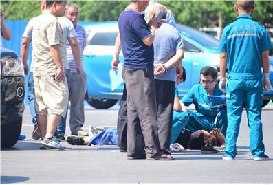 上午10點10分許,記者在現場看到,一輛黑色的摩托車車頭朝南,斜躺在路上,旁邊停著一輛黑色的路虎車,一名受傷的男子被急救人員抬上了救護車,該男子右腳被膠布包裹,還有少量鮮血從膠布中滲出。一名男子手里拿著手機,低聲呻吟,在地面上還躺著一名男子,表情痛苦不堪,一手捂著腹部,一手遮擋著刺眼的太陽光。他的旁邊有一只沾滿鮮血的毛巾和鞋子,鞋子的后腳跟鞋幫已經斷裂,地面上留下斑斑血跡。