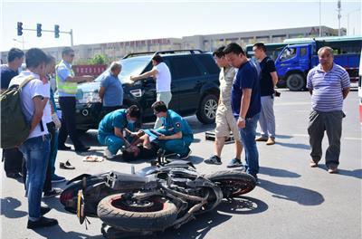 5月25日上午9點50分許,鄭州商都路與明理路交叉口發生一起嚴重車禍,一輛摩托車涉嫌闖紅燈,撞上了一輛正常通過路口的路虎車,摩托車上的兩名男子受傷,后被緊急送往醫院救治。