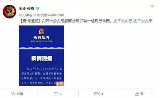 6月13日早上,“安陽殷都”官方微博發布了一件案情通報:安陽市公安局殷都分局偵破一起現行命案。