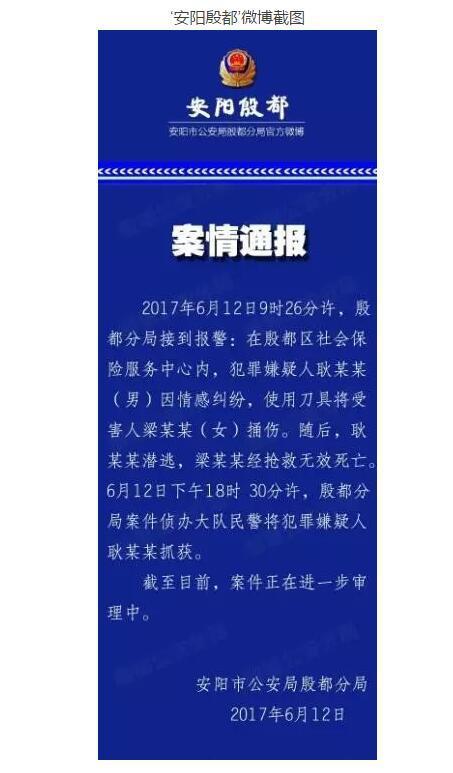 2017年6月12日9時26分許,殷都分局接到報警:在殷都區社會保險服務中心內,犯罪嫌疑人耿某某(男)因情感糾紛,使用刀具將受害人梁某某(女)捅傷。隨后,耿某某潛逃,梁某某經搶救無效死亡。6月12日下午18時30分許,殷都分局案件偵辦大隊民警將犯罪嫌疑人耿某某抓獲。
