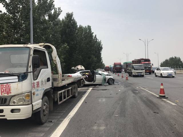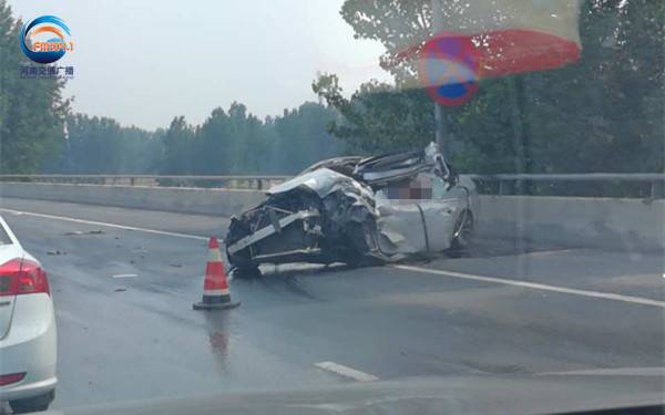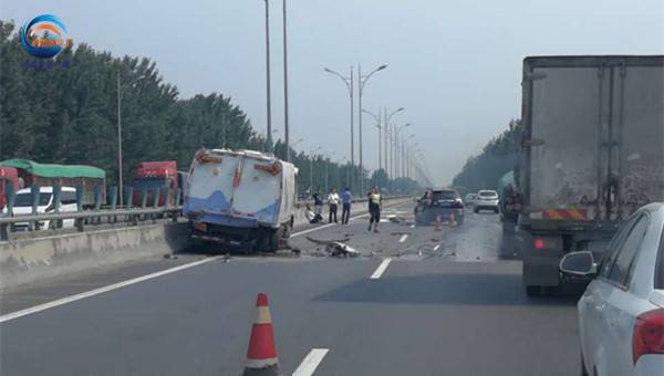 上午11時左右,河南交通廣播記者晁兮、士超到達現場,從現場了解到,事故發生時道路清掃車在正常作業,一輛白色寶馬追尾了清掃車,緊接著一輛黑色SUV也發生追尾,其中白色寶馬車被撞的已經報廢。