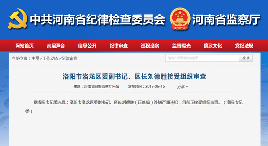 據(jù)洛陽市紀委消息:洛陽市洛龍區(qū)委副書記、區(qū)長劉德勝(正處級)涉嫌嚴重違紀,目前正接受組織審查。(洛陽市紀委)