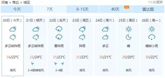 明天:全省多云,有分散性陣雨、雷陣雨,黃淮之間局部有短時大風、短時強降水等強對流天氣。