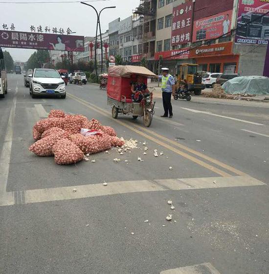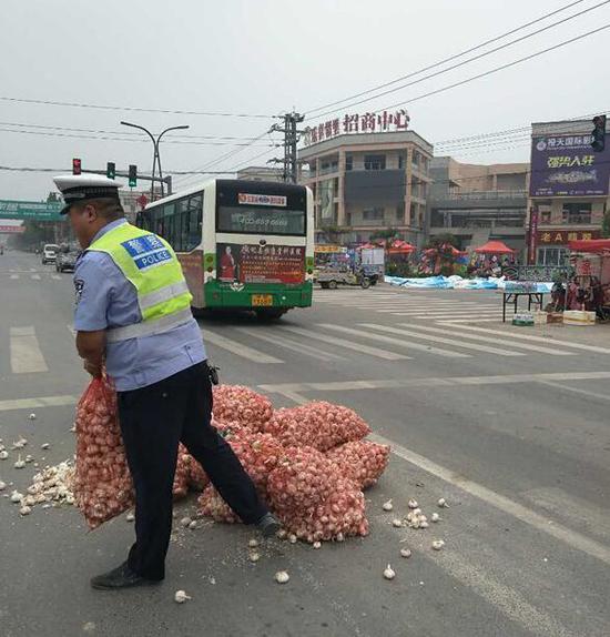 7月28日上午11時左右,杞縣交警大隊四中隊民協警在G106國道巡邏執勤,當行駛至杞縣東關萬商城附近時一件事情引起了民警注意,原來,一輛拉滿大蒜的農用車在萬商城路口等紅綠燈時掉落了好幾袋大蒜,因為聲音嘈雜、裝載較多司機并沒有發現異常,綠燈后繼續駕車前行。剩下了六、七袋大蒜散落在路中間。看到這一情況后,杞縣交警大隊四中隊民警立即上前提醒車主,可是為時已晚,見此情景后,四中隊民協警兵分兩路,一方面驅車去追趕失主;一方面組織警力對散落大蒜進行清理、集中,指揮車輛有序通過,看管好大蒜,避免丟失和損壞。