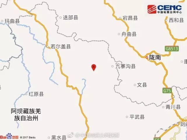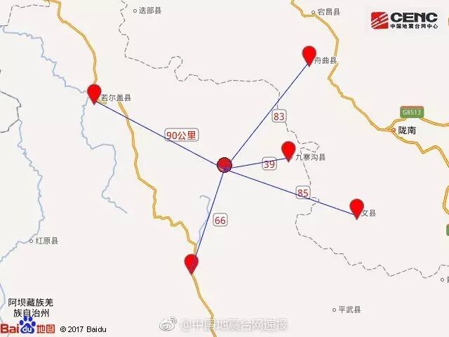 震中距九寨溝縣39公里、距松潘縣66公里、距舟曲縣83公里、距文縣85公里、距若爾蓋縣90公里,距隴南市105公里,距成都市285公里。