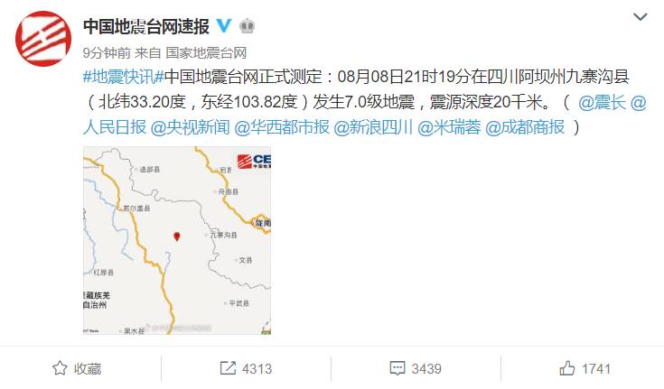 四川九寨溝縣發(fā)生7.0級地震 鄭州有震感