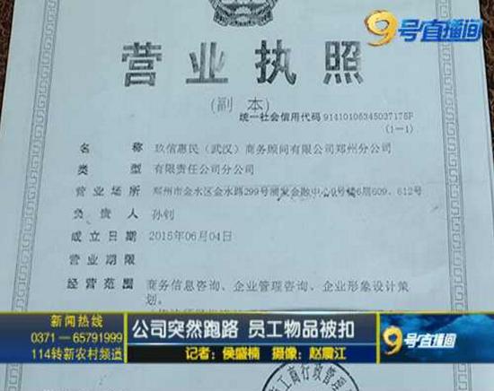 甄女士說,他們公司全稱是玖信惠民商務顧問有限公司,總部在武漢,全國一共有30多家分公司,鄭州是其中的一家,他們公司的總經(jīng)理是總公司委派的,平時的工資發(fā)放也是武漢總公司負責的。就在上周,他們的分公司的總經(jīng)理突然辭職了。