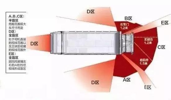 從這張圖片我們可以看到大貨車的盲區示意圖,具體的盲區要根據具體情況分析,但是差別并不是很大。從這張圖我們就可以知道,ABC區屬于半盲區,D、E區屬于全盲區。