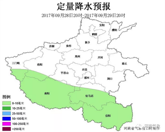29日,許昌以南大部分地區有小雨,其中信陽地區和南陽、駐馬店兩地區南部有中雨,局部大雨。