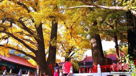 銀杏樹是中國獨有的冰川紀孑遺植物,被稱為“活化石”。因生長、結果緩慢,常常是“公”植樹而“孫”得利,因而民間又稱銀杏樹為“公孫樹”。目前,文殊寺內的銀杏樹進入最佳觀賞期,吸引不少游客慕名前來一睹古樹風采。韓章云 攝