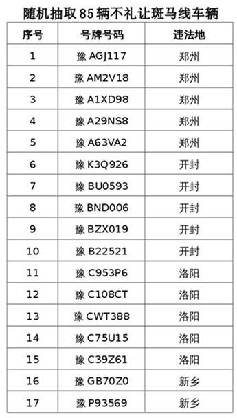記者了解到,此次1月25日“交通違法曝光日”,河南省公安廳交警總隊(duì)對近期全省各地交警查處的機(jī)動車不禮讓斑馬線被處罰的其中85輛(隨機(jī)抽取不禮讓斑馬線車輛)進(jìn)行曝光,警示提示廣大機(jī)動車駕駛?cè)艘婪ā踩⑽拿餍熊嚕屪鸱ㄎ拿鞫Y讓成為城市道路交通新風(fēng)尚。