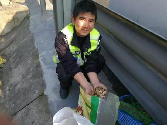 經(jīng)過兩個多小時的尋找,高速交警和巡查幫撿回了大部分硬幣。
