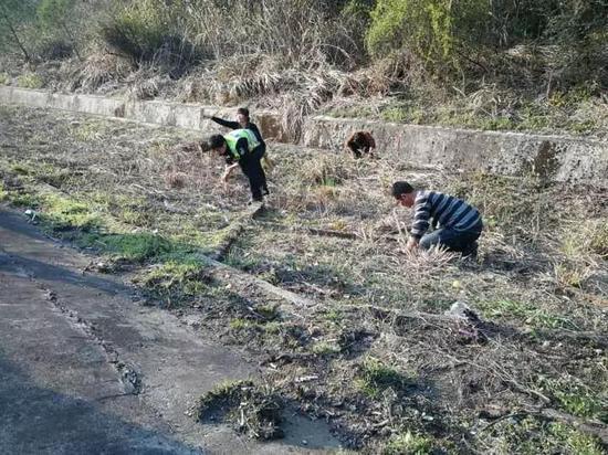 六萬多枚硬幣,可不是那么好撿的,開始的時候還能一把一把地抓錢,越到后面越難找。五角錢的硬幣是黃色的,跟高速公路邊的枯草顏色很接近。大家都要靠樹枝掰開枯草才能找到。