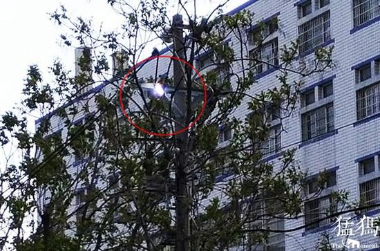 順著路口東南角望去,只見(jiàn)一根電線(xiàn)桿頂端隨著噼噼啪啪的響聲,不斷有火花冒出,忽大忽小。巡防員曹建軍和隊(duì)友急忙疏散路人,讓大家與線(xiàn) 桿保持一定距離,以免發(fā)生危險(xiǎn)。