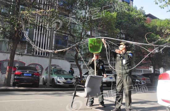 今日上午,記者在現場看到,一捆黑色的電纜線從道路兩邊的樹上垂落在道路中間,電纜線下放著一張椅子和一把清理垃圾的塑料锨,將垂落的電線高高支起;旁邊有幾名巡防隊員在不停疏導交通,并不時爬上爬下為過往較高的車輛抬起電纜線。據現場巡防隊員告訴記者,他們通過查詢該路段監控發現,被掛斷的電纜線是在凌晨3時5分,被一輛途經工程車給掛斷,工程車也隨之逃之夭夭。早上7時,當他們巡邏到此處,現場交通就已發生嚴重擁堵,他們立即找來工具疏導交通。