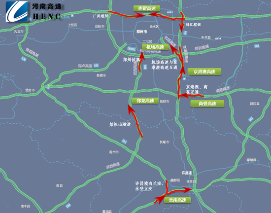 區(qū)間連接線:機場高速與京港澳高速互通往鄭州市區(qū)方向、商登高速往西與京港澳互通