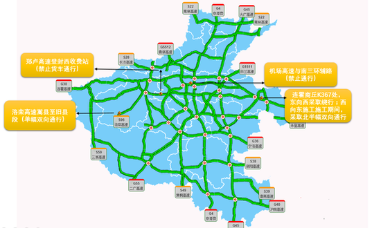 對策:連霍高速開封站車流量會非常大,可提前繞行大廣高速開封杜良站或鄭民高速各站口通行;寧洛高速周口豫皖省界站可提前繞行連霍高速或滬陜高速。