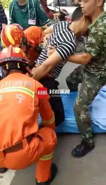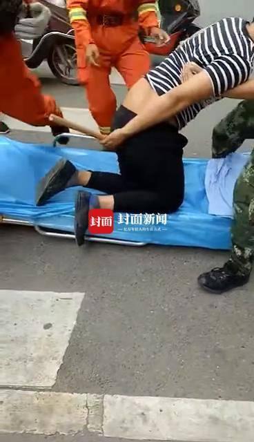 為減輕痛苦,讓男子盡快得到救治,消防官兵扶住竹子減少晃動,另一名戰(zhàn)士小心翼翼地把竹子鋸斷。隨后,消防官兵將該男子臺上已經(jīng)趕到現(xiàn)場的救護(hù)車。