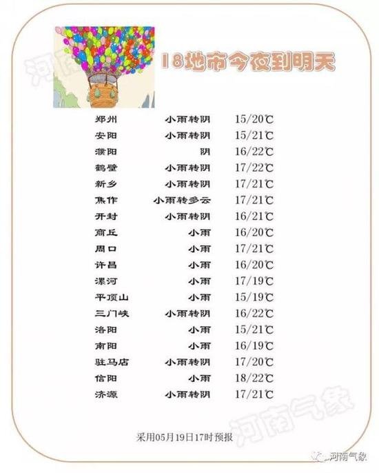 今天夜里,全省陰天有小雨,其中商丘、周口、信陽三地區和南陽地區南部部分地區有中雨。